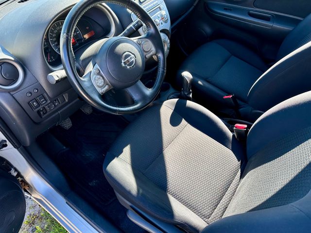 • Weitere Ausstattung: Airbag Beifahrerseite abschaltbar, Airbag Fahrer-/Beifahrerseite und Seitenairbag vorn, Außenspiegel elektr. verstellbar, Außenspiegel Wagenfarbe, Bremsassistent (Nissan Brake-Assist), Comfort-Paket, Fernentriegelung Tankklappe, Frontscheibe Verbundglas, Gepäckraumabdeckung / Rollo, Heckscheibe heizbar, Innenspiegel abblendbar, Isofix-Aufnahmen für Kindersitz, Karosserie: 5-türig, Klimaautomatik, Kopf-Airbag-System, Kopfstützen hinten verstellbar (links/rechts und mitte), Lenksäule (Lenkrad) höhenverstellbar, Leseleuchte vorn, Motor 1,2 Ltr. - 59 kW KAT, Reserverad als Notrad, Rücksitz geteilt/klappbar, Schadstoffarm nach Abgasnorm Euro 5, Schalt-/Wählhebelgriff Leder, Sitz vorn links höhenverstellbar, Sitzbezug / Polsterung: Stoff, Sonnenblenden mit Spiegel, Steckdose (12V-Anschluß) in Mittelkonsole, Stoßfänger Wagenfarbe, Türverkleidung mit Stoffeinsatz, Verglasung getönt