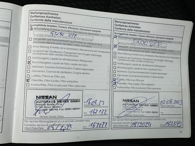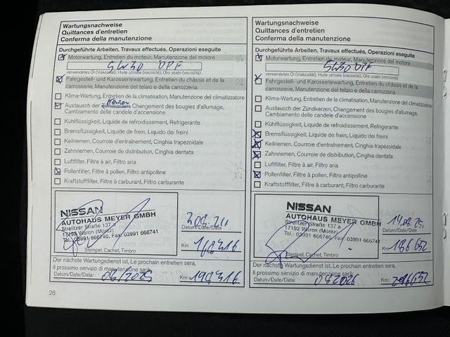Weitere Ausstattung: 3. Bremsleuchte, 4 Lautsprecher, Airbag Beifahrerseite abschaltbar, Airbag Fahrer-/Beifahrerseite und Seitenairbag vorn, Audiobedienung am Lenkrad, Audiosystem: Radio mit CD- und MP3-Player, Auto-Hold-Funktion, AUX-IN-Anschluss (AUX-IN), Außenspiegel elektr. verstell- und heizbar, Außenspiegel Wagenfarbe, Außentemperaturanzeige, Blinkleuchte in Außenspiegel integriert, Bluetooth-Schnittstelle, Bordcomputer, Bremsassistent (Nissan Brake-Assist), Coming-Home-Lichtfunktion (Friendly Lightning), Elektr. Bremskraftverteilung (EBD), Fahrassistenz-System: Aktive Fahrkomfortregelung (Fahrwerksdämpfung), Fahrassistenz-System: Berganfahr-Assistent, Fahrassistenz-System: Kurvenbremskontrolle (Aktive Spurkontrolle), Fahrer-Informations-System (FIS) mit Farbdisplay, Fensterheber elektrisch vorn + hinten, Fernentriegelung Tankklappe, Freisprechanlage Bluetooth, Frontscheibe Verbundglas, Gepäckraumabdeckung / Rollo, Getränkehalter in Mittelkonsole, Gurtstraffer, Handschuhfach beleuchtet, Heckscheibe heizbar, Innenraumfilter: Pollenfilter, Innenspiegel abblendbar, Isofix-Aufnahmen für Kindersitz, Karosserie: 5-türig, Kopf-Airbag-System, Kopfstützen vorn und hinten verstellbar, Lenkrad mit Multifunktion, Lenksäule (Lenkrad) höhen-/längsverstellbar, Leseleuchte vorn, Motor 1,5 Ltr. - 81 kW Turbodiesel KAT, Nebelschlussleuchte, Parkbremse elektrisch, Radioempfang digital (DAB), Radstand 2646 mm, Reifen-Reparaturset, Reifendruck-Kontrollsystem, Rücksitz geteilt/klappbar, Schadstoffarm nach Abgasnorm Euro 5, Schaltpunktanzeige, Scheibenwischer mit Intervallschaltung, Sitz vorn links höhenverstellbar, Sitzbezug / Polsterung: Stoff, Sonnenblenden mit Spiegel, Start/Stop-Anlage, Steckdose (12V-Anschluß) in Mittelkonsole, Türgriffe innen schwarz, hochglänzend, USB-Schnittstelle, Wärmeschutzverglasung mit UV-Schutz